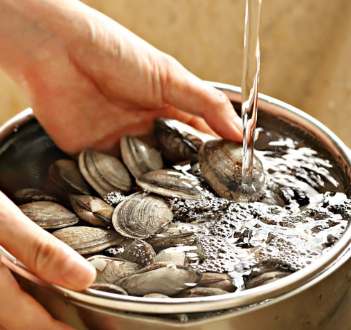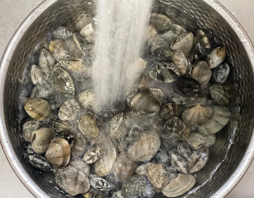 먼저 바지락을 흐르는 물에 가볍게 문질러 2~3회 헹궈 겉면의 불순물을 제거합니다.